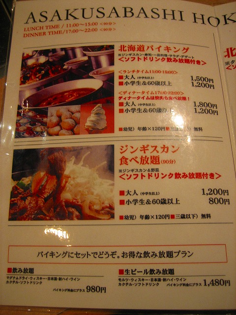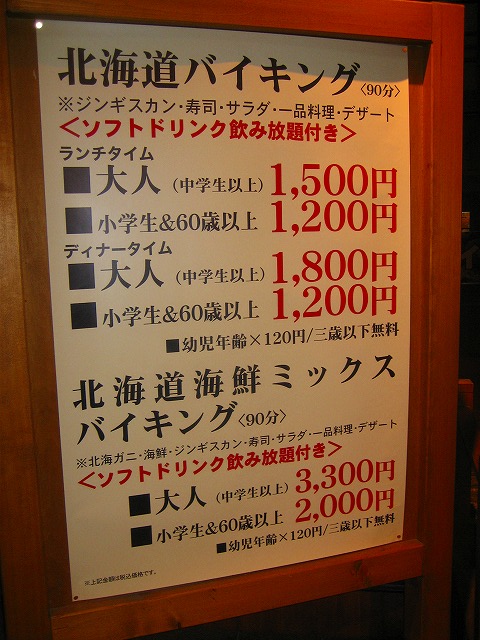北海道バイキング¥1800+生ビール飲放¥1480=¥3280