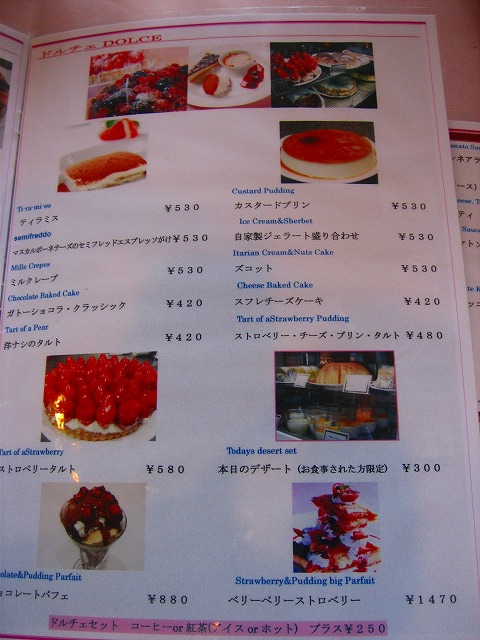 店内に入りますと大きな薪釜があり、一気に焼き上げるピッツァも美味しいと評判ですし、メニュー右下のベリーベリーストロベリーという2~3人で食べる巨大パフェは、とても有名だそうです。