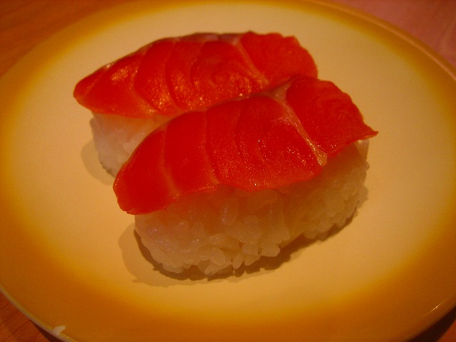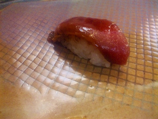 マグロです。こちらには、煮きり醤油が塗られています。