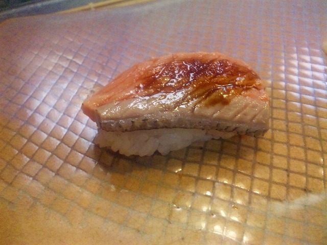 時鮭です。こちらは、皮の裏側の脂を炙って煮きり醤油が塗られていま