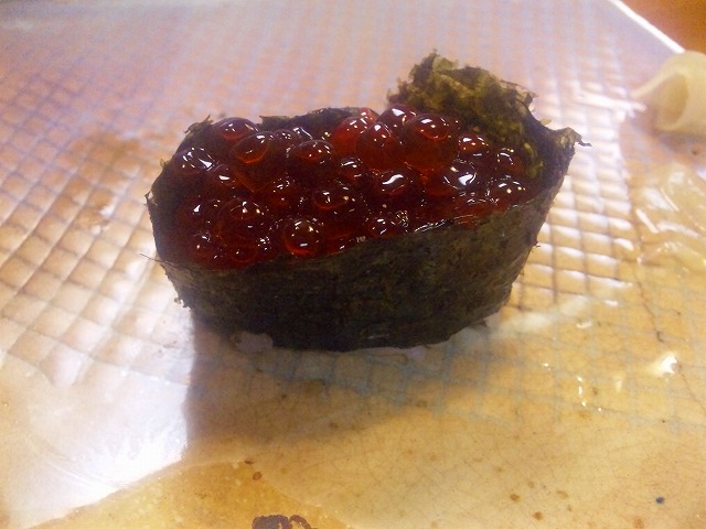 いくらです。見た目は普通のいくらですが、中に鷹の爪が小さく入って