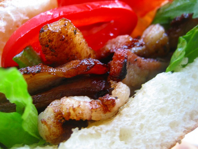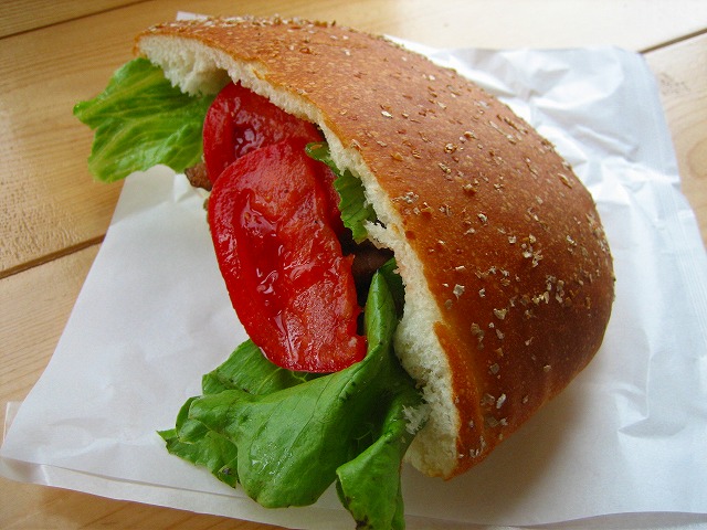 大きなパンに、しっかり味付けされたベーコンとトマトなどの野菜が