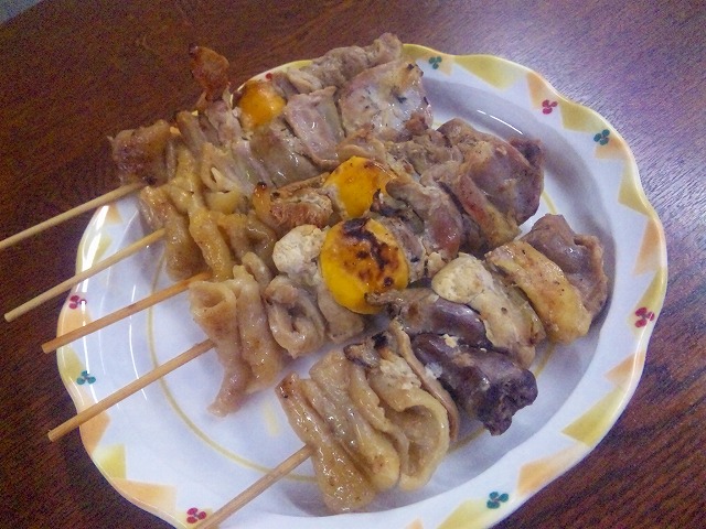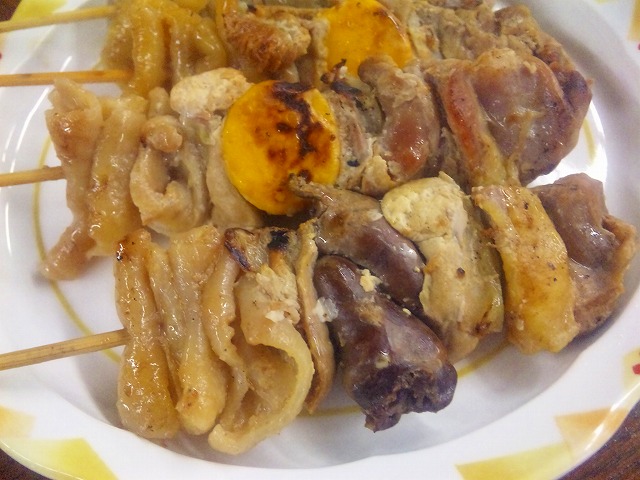もつ串でしょう!。色々な部位の肉が刺さってます。