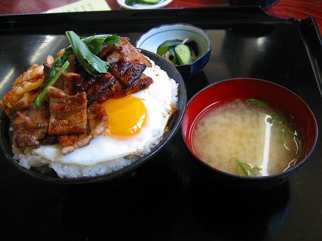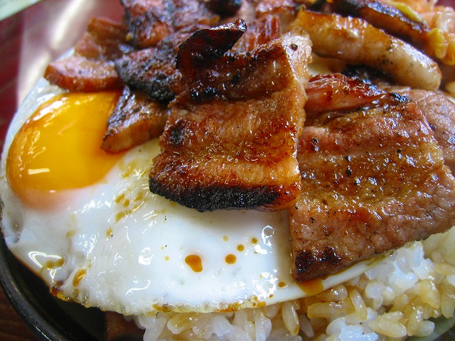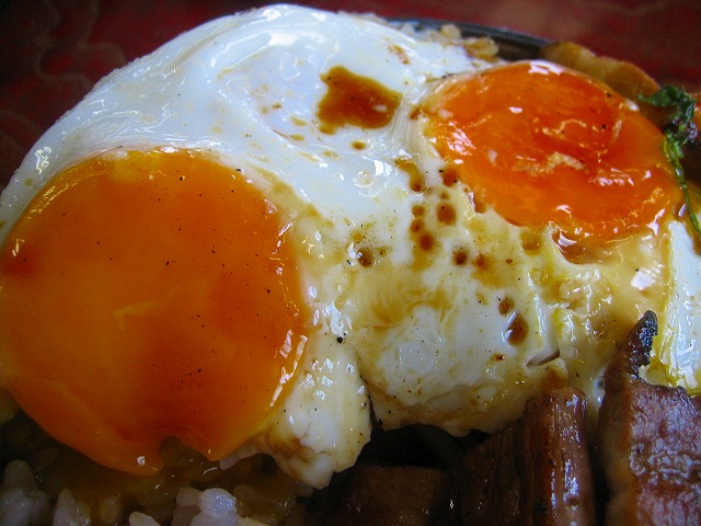 目玉焼きが2個、肉は2段盛りでご飯の中にも入ってます。