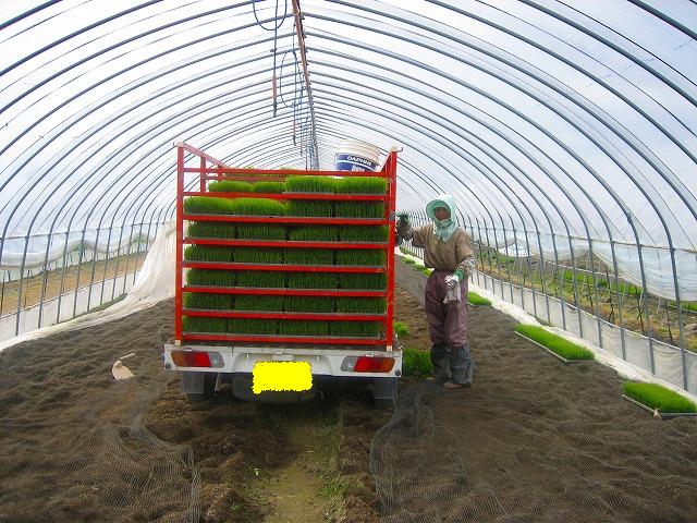 この育った苗を軽トラで運びます。水留さんは奥の田んぼにいました。